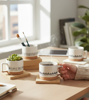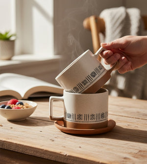 Rustic Style: The distinctive earth-toned band at the bottom of the mugs and the natural ceramic texture at the top create an authentic and bohemian atmosphere.