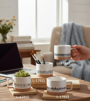 Unique Designs: The black and white geometric and tribal motifs surrounding the mugs are inspired by traditional handicrafts. Each design tells its own story, adding depth to the mugs.