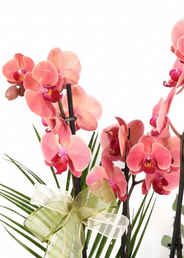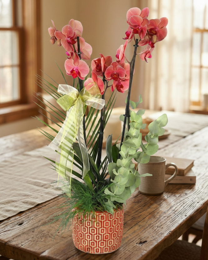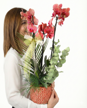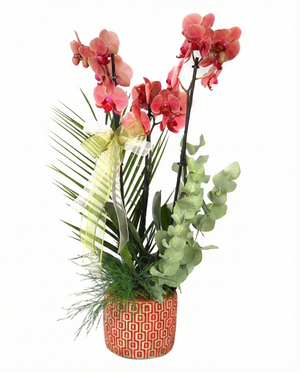 Kırmızı beton saksıda İthal Çift Dallı Ateş Orkide, Okaliptus, Fenix ve Boyalı.
